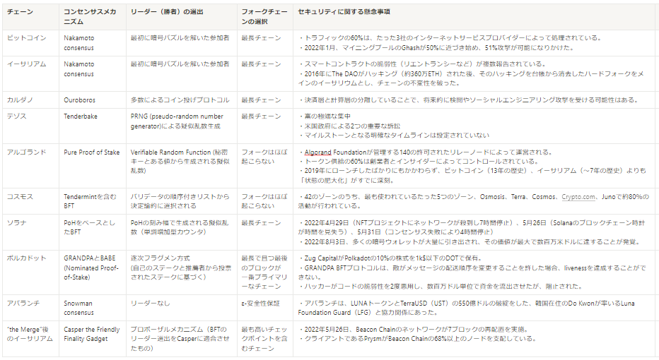 表4. 各チェーンのコンセンサスメカニズムとセキュリティに関する懸念事項